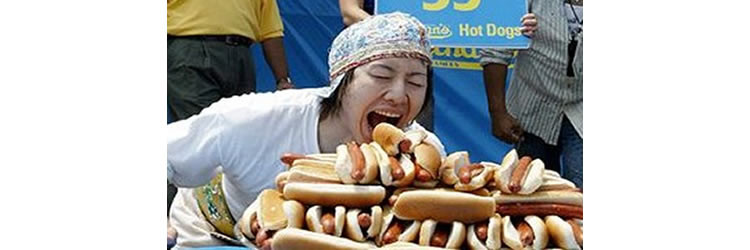 Competitive eating is about consuming as much of a particular food as possible in an allocated time.  Kobayashi has 8 different world records.  He is probably most famous for his performance in Nathan’s Coney Island Hot Dog Eating Contest.  In his first appearance on July 4 2001 he ate 50 hot dogs in 12 minutes – doubling the previous record of 25.